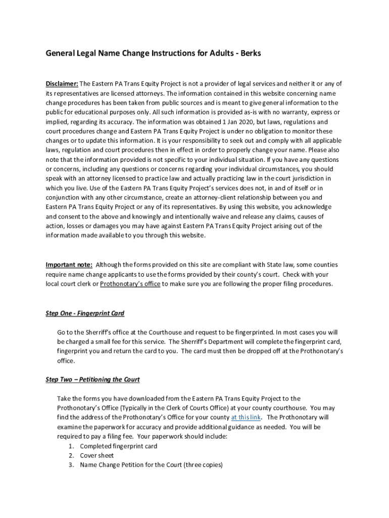 General Legal Name Change Instructions for Adults Berks Disclaimer: The Eastern PA Trans Equity Project is not a provider of legal services and neither it nor any of its representatives are licensed
