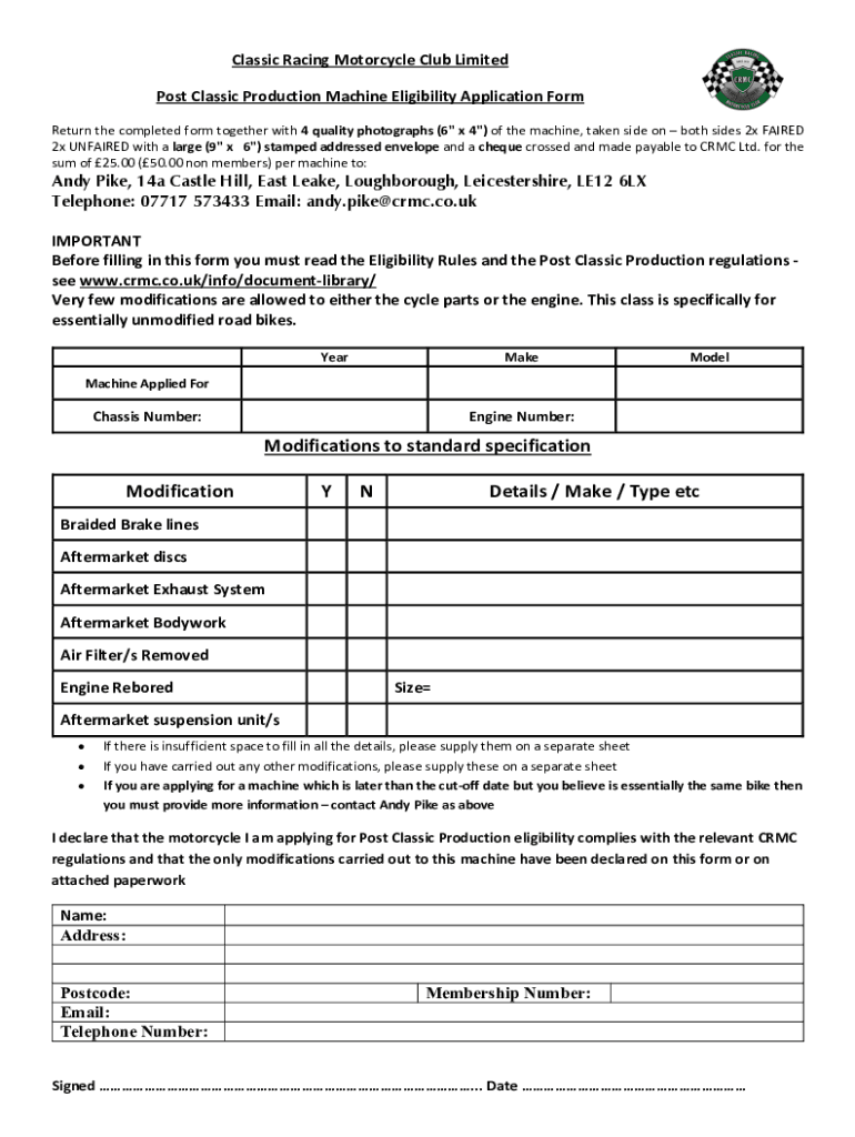 Classic Racing Motorcycle Club Limited Post Classic Production Machine Eligibility Application Form Return the completed form together with 4 quality photographs (6\” x 4\”) of the machine, taken