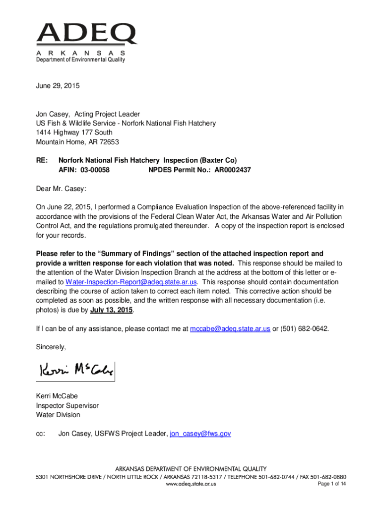 June 29, 2015Jon Casey, Acting Project Leader US Fish & Wildlife Service Norfolk National Fish Hatchery 1414 Highway 177 South Mountain Home, AR 72653 RE:Norfolk National Fish Hatchery Inspection