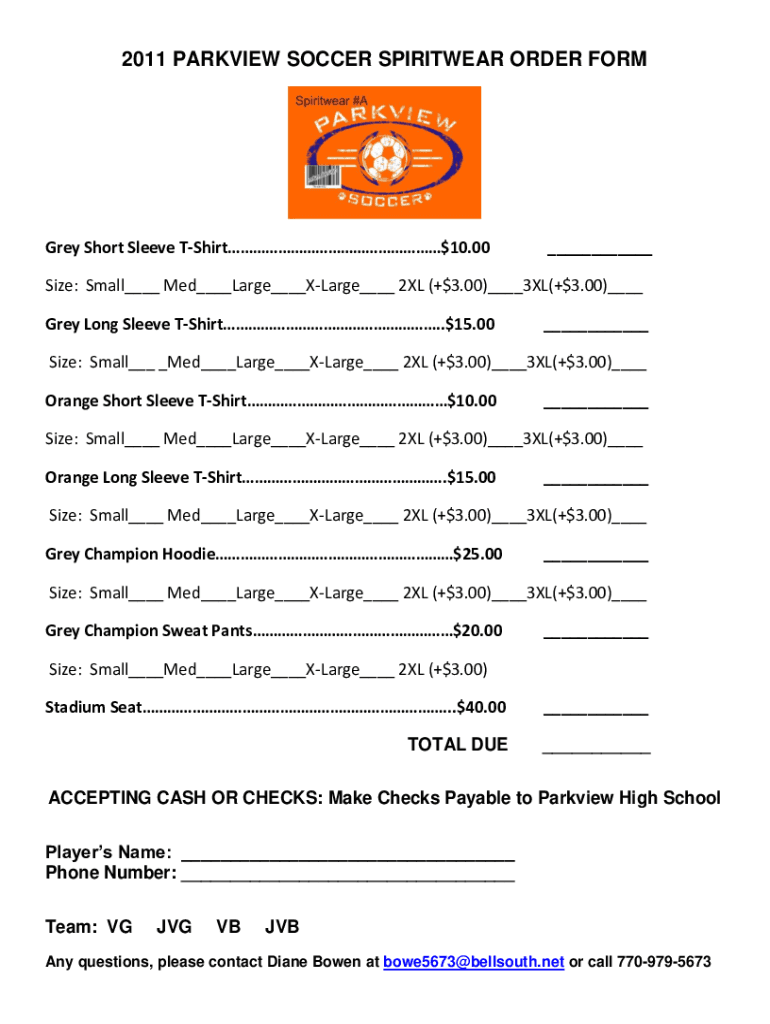 2011 PREVIEW SOCCER SPIRITUAL ORDER FORM Grey Short Sleeve TShirt$10.00___Size: Small___ Med___Large___Large___ 2XL (+$3.00)___3XL(+$3.00)___ Grey Long Sleeve Shirt.$15.00___Size: Small___ _Med___Large___Large___