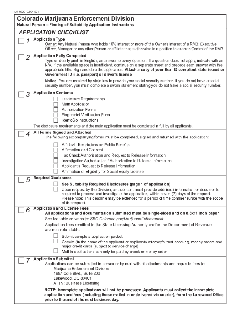 Marijuana Finding of Suitability Application Natural PersonMarijuana Enforcement Division DR 8520 (02/04/22)DR 8520 (02/04/22)Colorado Marijuana Enforcement Division Natural Person Finding of Suitability