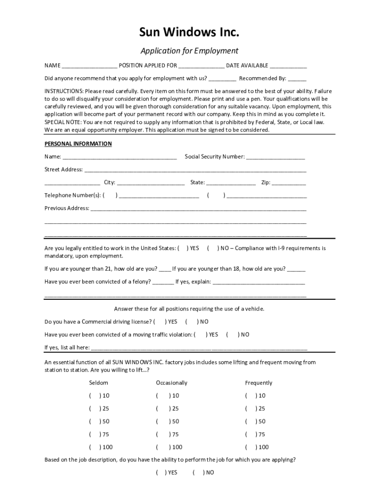 Sun Windows Inc. Application for Employment NAME ___ POSITION APPLIED FOR ___ DATE AVAILABLE ___ Did anyone recommend that you apply for employment with us? ___ Recommended By: ___ INSTRUCTIONS: Please