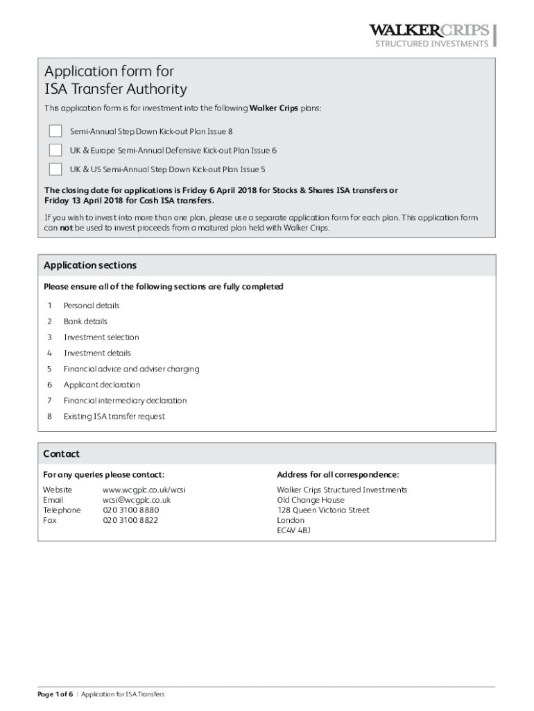 Application form for ISA Transfer Authority This application form is for investment into the following Walker Crops plans: Semiannual Step Down Sickout Plan Issue 8 UK & Europe Semiannual Defensive