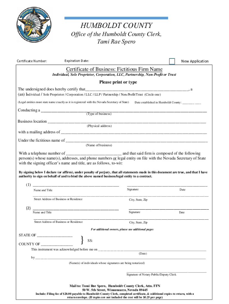 HUMBOLDT COUNTYOffice of the Humboldt County Clerk, Tami Rae Spiro Certificate Number:Expiration Date:New ApplicationCertificate of Business: Fictitious Firm NameIndividual, Sole Proprietor, Corporation,