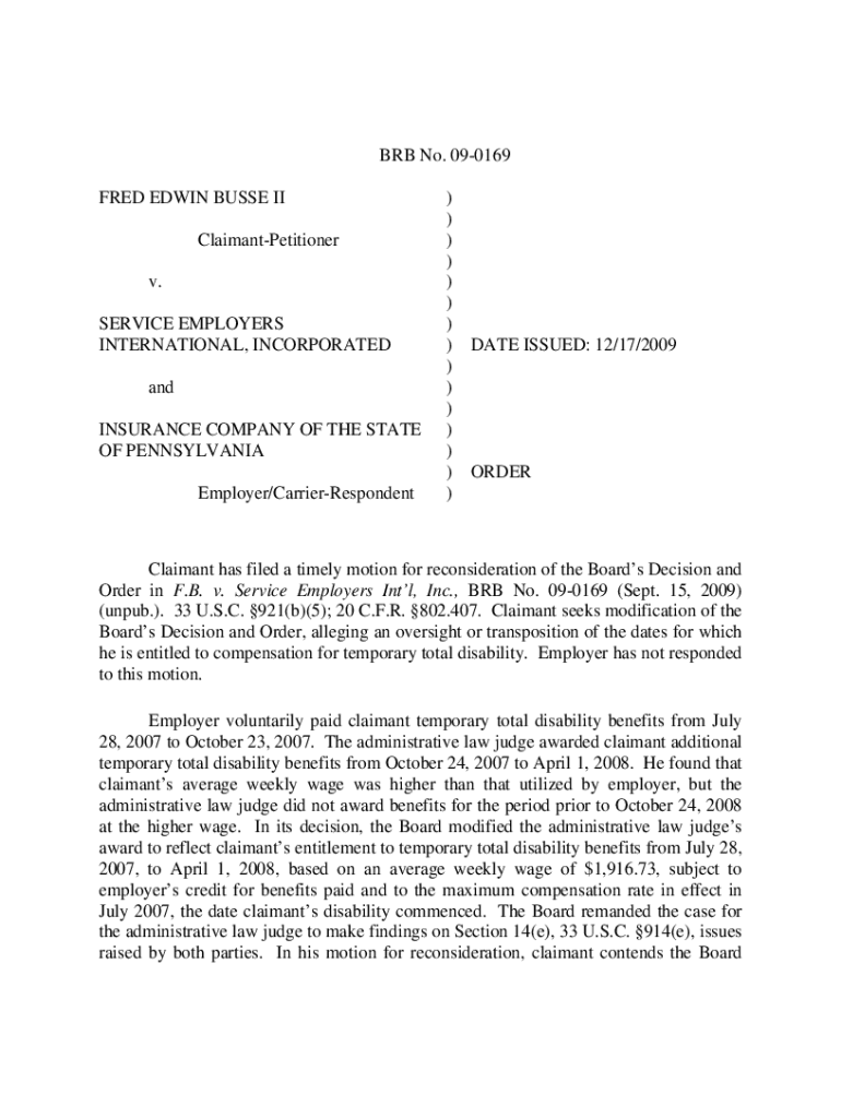 BRB No. 090169 FRED EDWIN BUSSED II ClaimantPetitioner v. SERVICE EMPLOYERS INTERNATIONAL, INCORPORATED and INSURANCE COMPANY OF THE STATE OF PENNSYLVANIA Employer/CarrierRespondent)))))))))))))))DATE