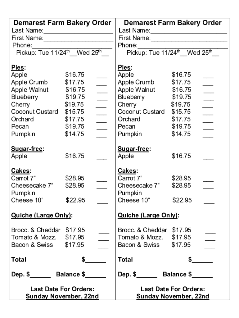 Dearest Farm Bakery OrderDemarest Farm Bakery Orders Name:___ Last Name:___ First Name:___ First Name:___ Phone:___ Phone:___ Pickup: Tue 11/24th__Wed 25th__ Pickup: Tue 11/24th__Wed 25th__ Pies: