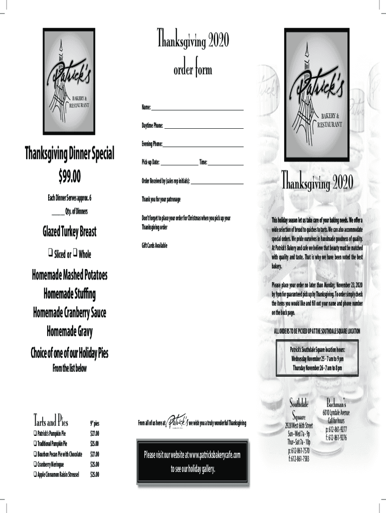 Thanksgiving 2020 order form BAKERY & RESTAURANTName: ___BAKERY & RESTAURANTDaytime Phone: ___Thanksgiving Dinner Special $99.00 Each Dinner Serves approx. 6 ___ Qty. Of DinnersGlazed Turkey Breast