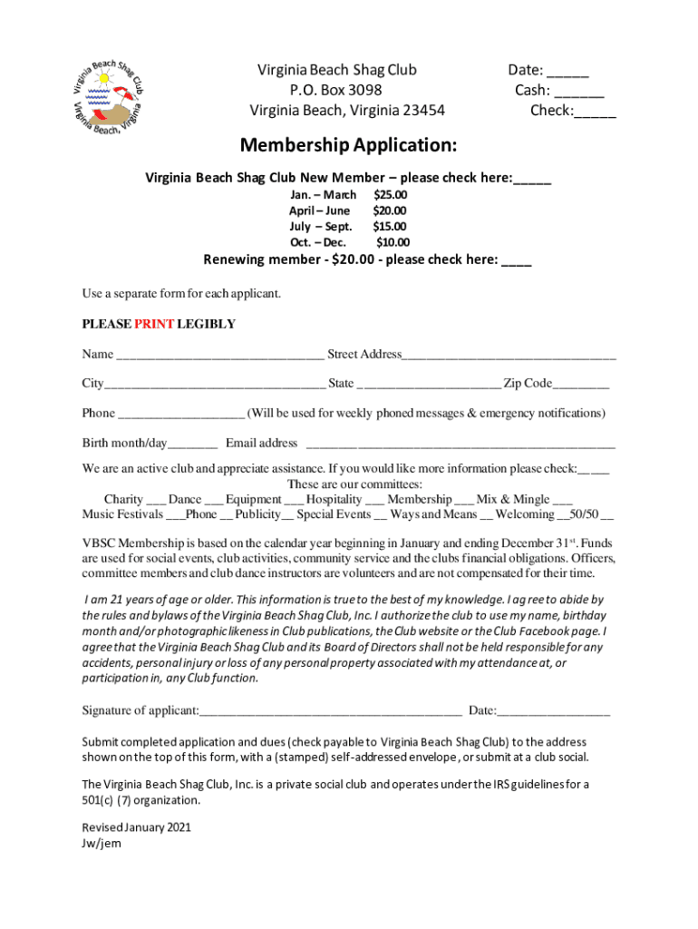 Virginia Beach Shag Club P.O. Box 3098 Virginia Beach, Virginia 23454Date: ___ Cash: ___ Check:___Membership Application: Virginia Beach Shag Club New Member please check here:___ Jan. March April