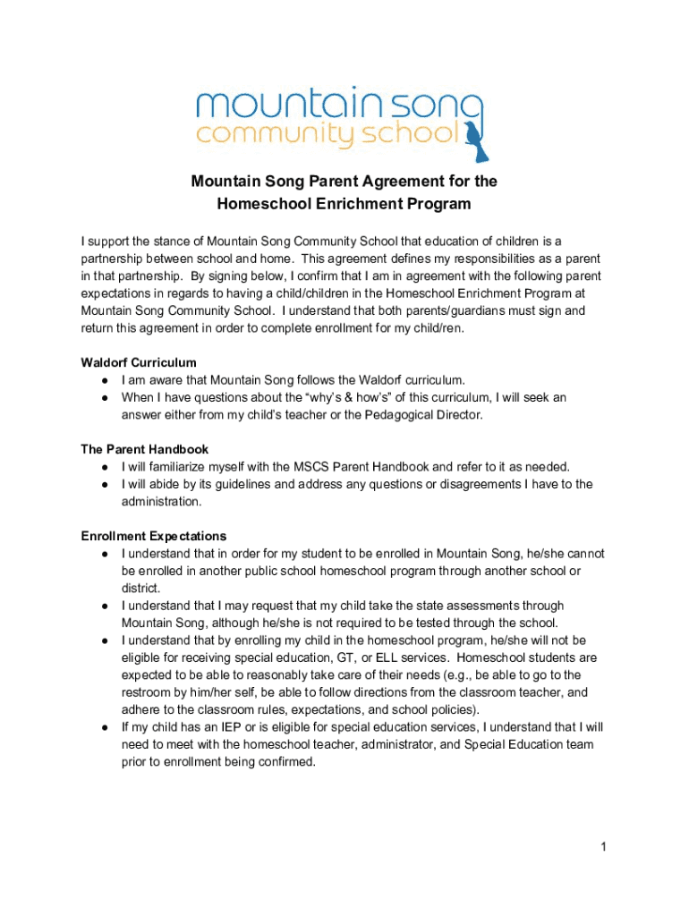 Mountain Song Parent Agreement is a form that must be completed by the parents or legal guardians of students attending Mountain Song Community School.
