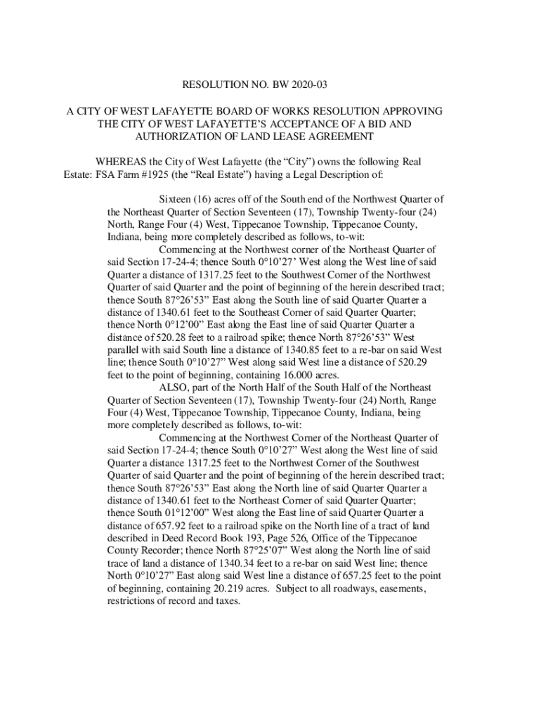 RESOLUTION NO. BY 202003 A CITY OF WEST LAFAYETTE BOARD OF WORKS RESOLUTION APPROVING THE CITY OF WEST LAFAYETTE ACCEPTANCE OF A BID AND AUTHORIZATION OF LAND LEASE AGREEMENT WHEREAS the City of West