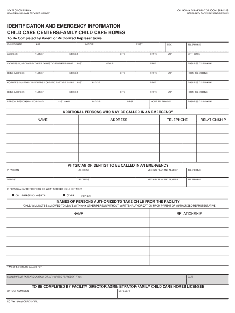 STATE OF CALIFORNIA HEALTH AND HUMAN SERVICES AGENCYCALIFORNIA DEPARTMENT OF SOCIAL SERVICES COMMUNITY CARE LICENSING DIVISIONIDENTIFICATION AND EMERGENCY INFORMATION CHILD CARE CENTERS/FAMILY CHILD