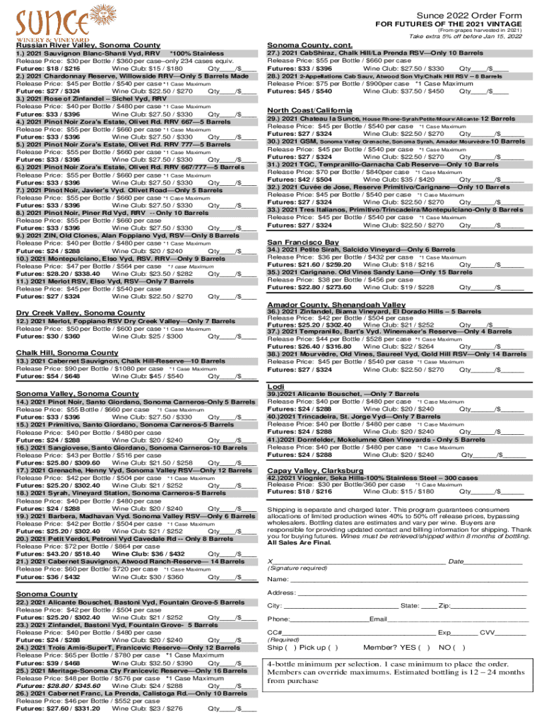 Since 2022 Order Form FOR FUTURES OF THE 2021 VINTAGE (From grapes harvested in 2021)Take extra 5% off before Jan 15, 2022Russian River Valley, Sonoma CountySonoma County, cont.1.) 2021 Avignon BlancShanti