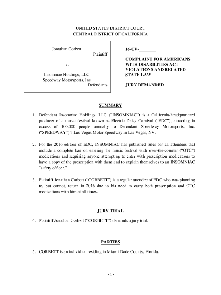 UNITED STATES DISTRICT COURT CENTRAL DISTRICT OF CALIFORNIA Jonathan Corbett,16CV___ Plaintiff COMPLAINT FOR AMERICANS WITH DISABILITIES ACT VIOLATIONS AND RELATED STATE Law. Insomniac Holdings, LLC,