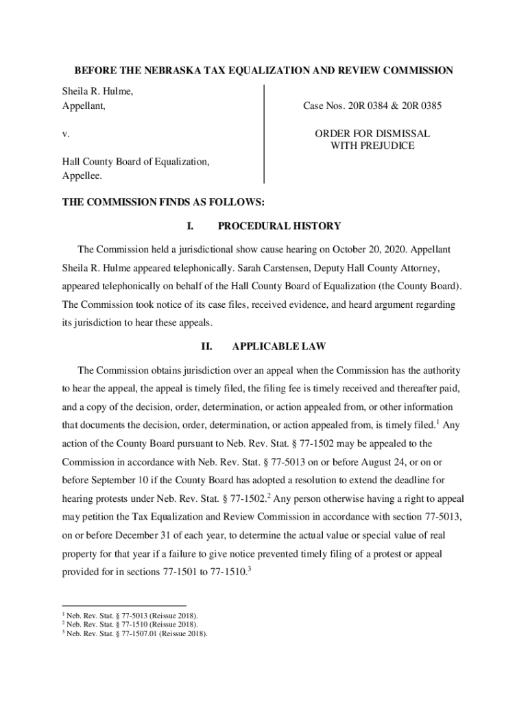 BEFORE THE NEBRASKA TAX EQUALIZATION AND REVIEW COMMISSION Sheila R. Hume, Appellant, Case Nos. 20R 0384 & 20R 0385v. ORDER FOR DISMISSAL WITH PREJUDICE Hall County Board of Equalization, Appealed.