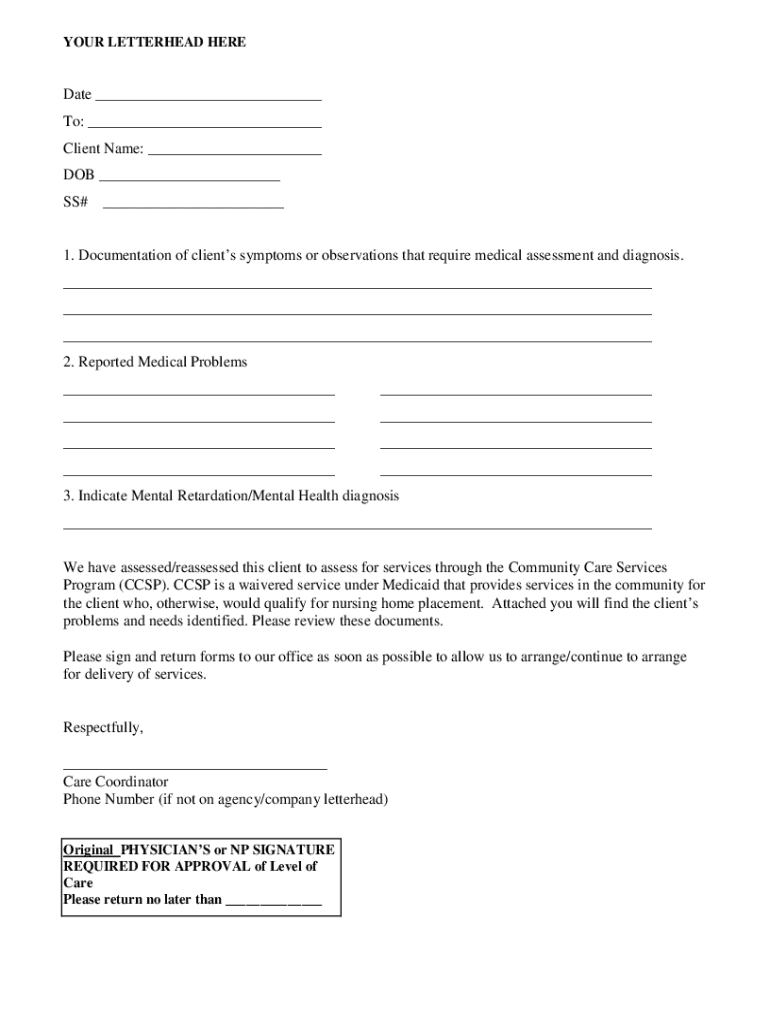 YOUR LETTERHEAD Heredity ___ To: ___ Client Name: ___ DOB ___ SS#___1. Documentation of clients symptoms or observations that require medical assessment and diagnosis. ___ ___ ___ 2. Reported Medical