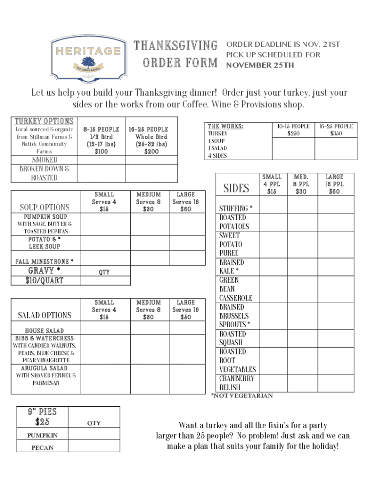 THANKSGIVING ORDER FORWARDER DEADLINE IS NOV. 21ST PICK UP SCHEDULED FOR NOVEMBER 25THLet us help you build your Thanksgiving dinner! Order just your turkey, just your sides or the works from our