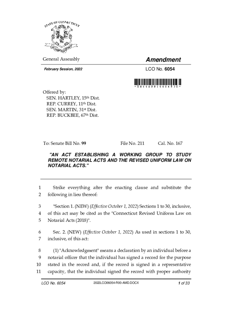 General AssemblyAmendmentFebruary Session, 2022LCO No. 6054Offered by: SEN. HARTLEY, 15th Dist. REP. CURRY, 11th Dist. SEN. MARTIN, 31st Dist. REP. BUCK BEE, 67th Dist. To: Senate Bill No. 99File