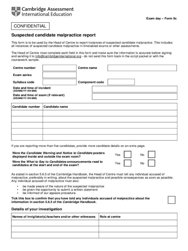 Exam day Form 9cCONFIDENTIAL Suspected candidate malpractice report This form is to be used by the Head of Center to report instances of suspected candidate malpractice. This includes all instances