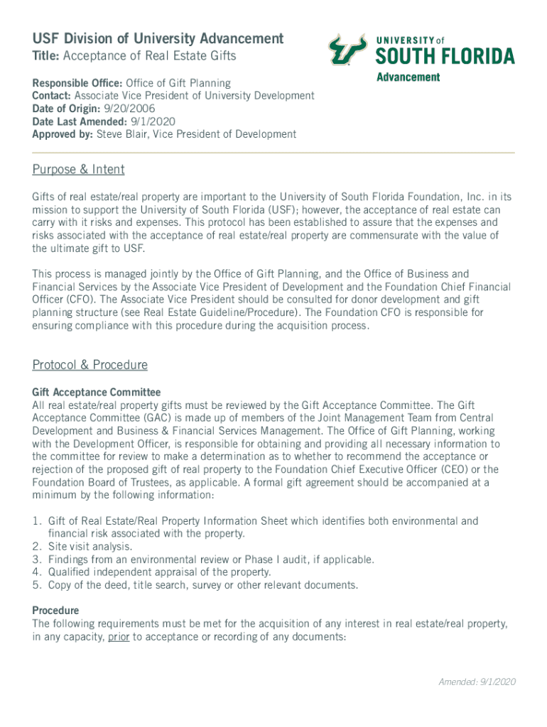 USF Division of University Advancement Title: Acceptance of Real Estate Gifts Responsible Office: Office of Gift Planning Contact: Associate Vice President of University Development Date of Origin: