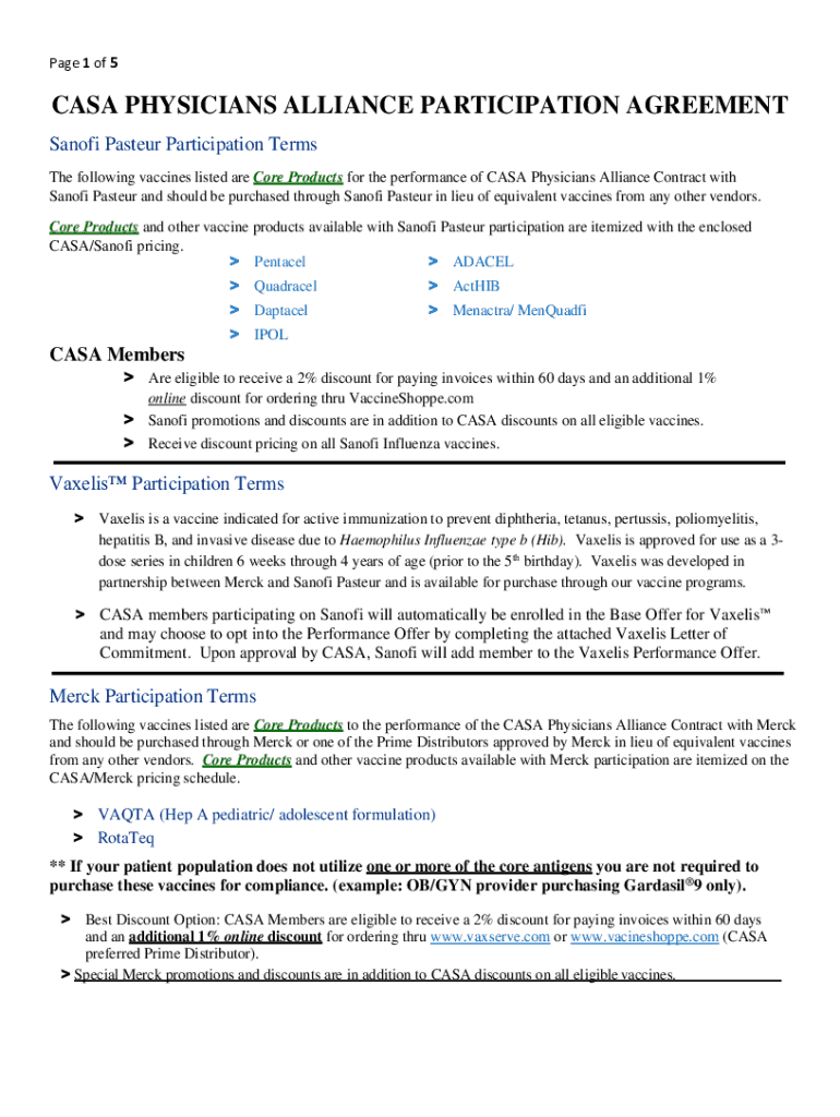 Page 1 of 5CASA PHYSICIANS ALLIANCE PARTICIPATION AGREEMENT Sanofi Pasteur Participation Terms The following vaccines listed are Core Products for the performance of CASA Physicians Alliance Contract