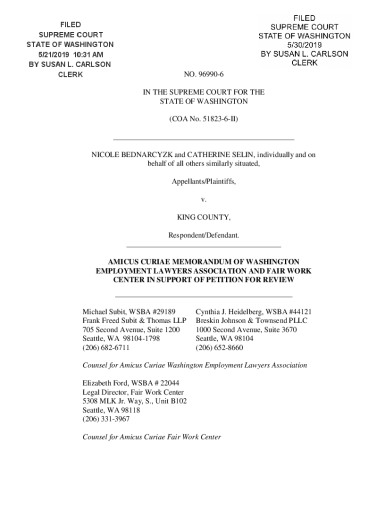 FILED SUPREME COURT STATE OF WASHINGTON 5/21/2019 10:31 AM BY SUSAN L. CARLSON CLERK NO. 969906 IN THE SUPREME COURT FOR THE STATE OF WASHINGTON (COA No. 518236II) ___NICOLE BEDNARCYZK and CATHERINE