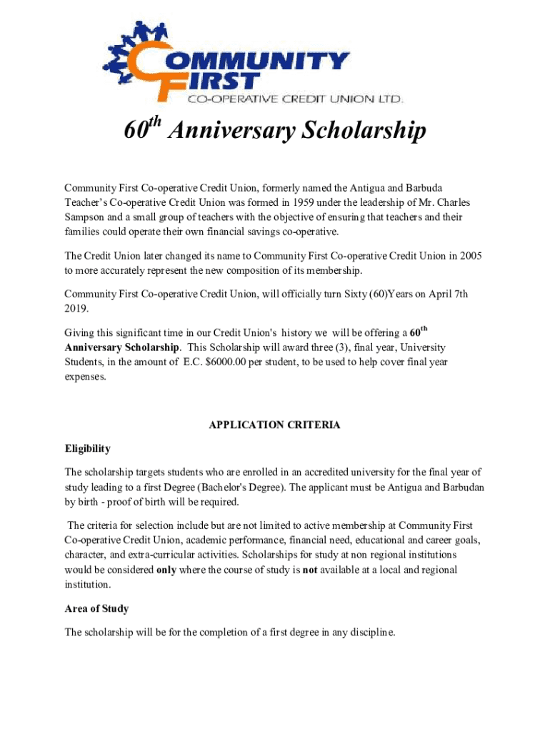 60th Anniversary Scholarship Community First Cooperative Credit Union, formerly named the Antigua and Barbuda Teachers Cooperative Credit Union was formed in 1959 under the leadership of Mr. Charles