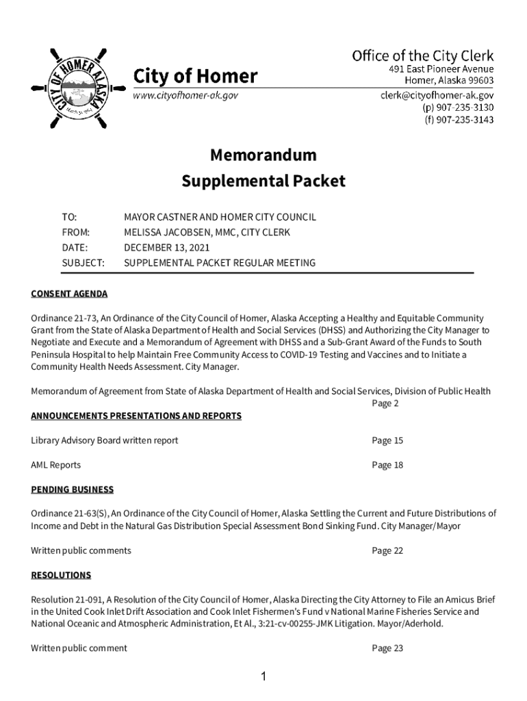 Memorandum Supplemental Packet TO: FROM: DATE: SUBJECT:MAYOR CASTER AND HOMER CITY COUNCIL MELISSA JACOBSEN, MMC, CITY CLERK DECEMBER 13, 2021, SUPPLEMENTAL PACKET REGULAR MEETINGCONSENT AGENDA Ordinance