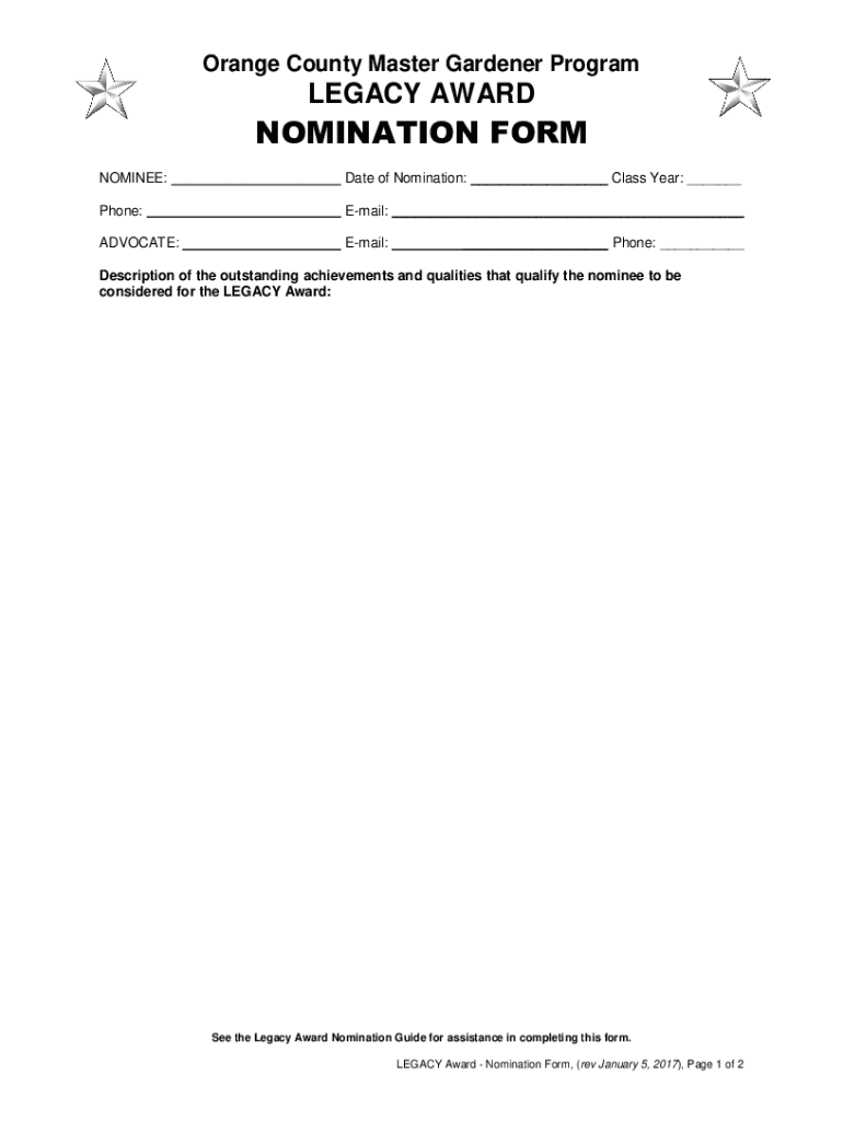 Orange County Master Gardener ProgramLEGACY AWARDNOMINATION FORM NOMINEE:Date of Nomination: ___ Class Year: ___Phone:Email: ___ADVOCATE:Email:___ Phone: ___Description of the outstanding achievements