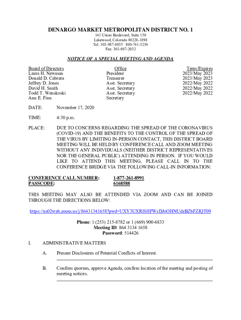 GENARO MARKET METROPOLITAN DISTRICT NO. 1 141 Union Boulevard, Suite 150 Lakewood, Colorado 802281898 Tel: 3039870835 8007413254 Fax: 3039872032 NOTICE OF A SPECIAL MEETING AND AGENDA Board of Directors