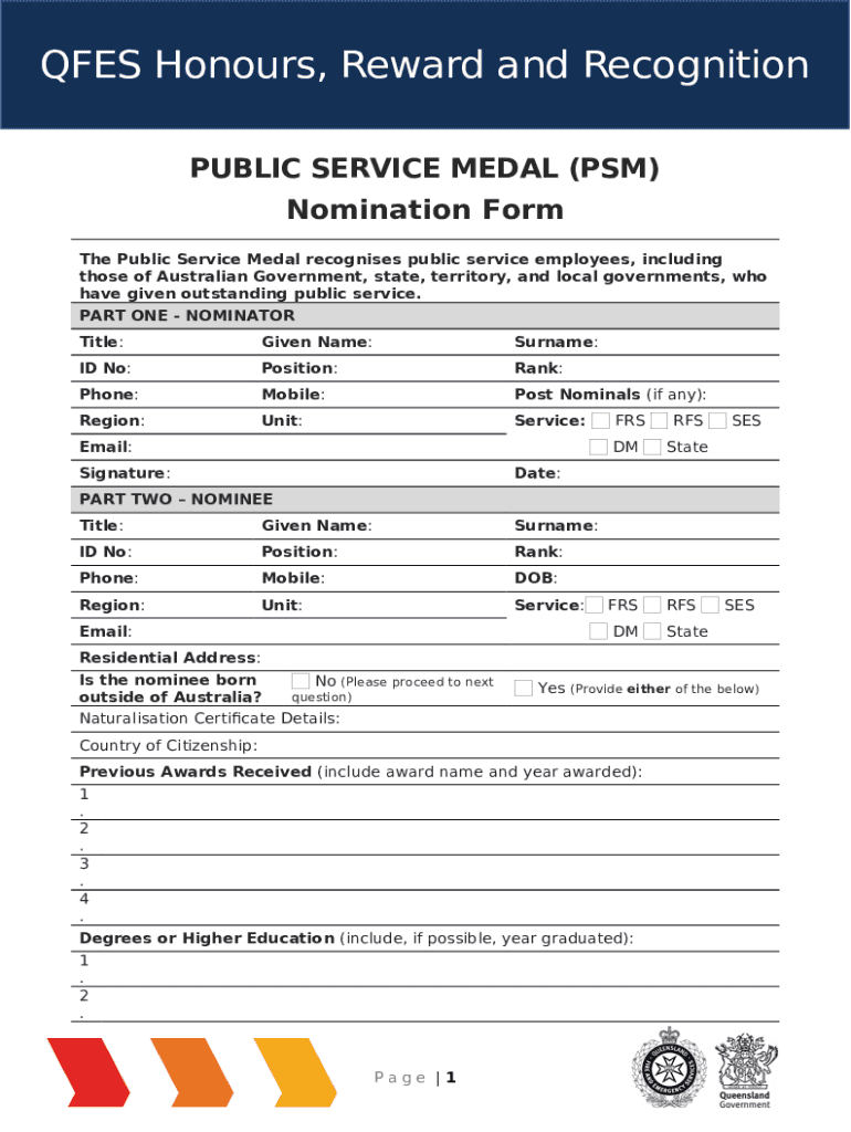 What is www.pmc.gov.ausitesdefaultPublic Service Medal nomination - Department of the ... Form?