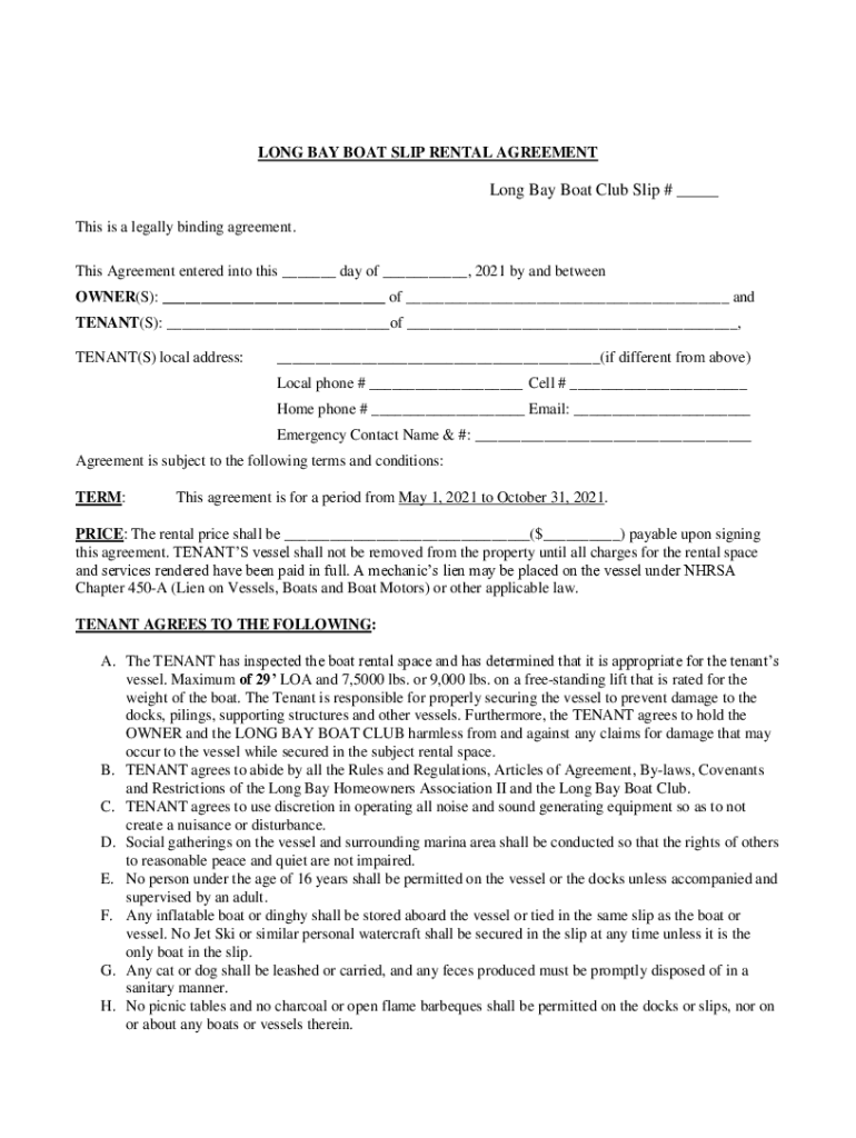 LONG BAY BOAT SLIP RENTAL AGREEMENT Long Bay Boat Club Slip # ___ This is a legally binding agreement. This Agreement entered into this ___ day of ___, 2021 by and between OWNER(S): ___ of ___ and