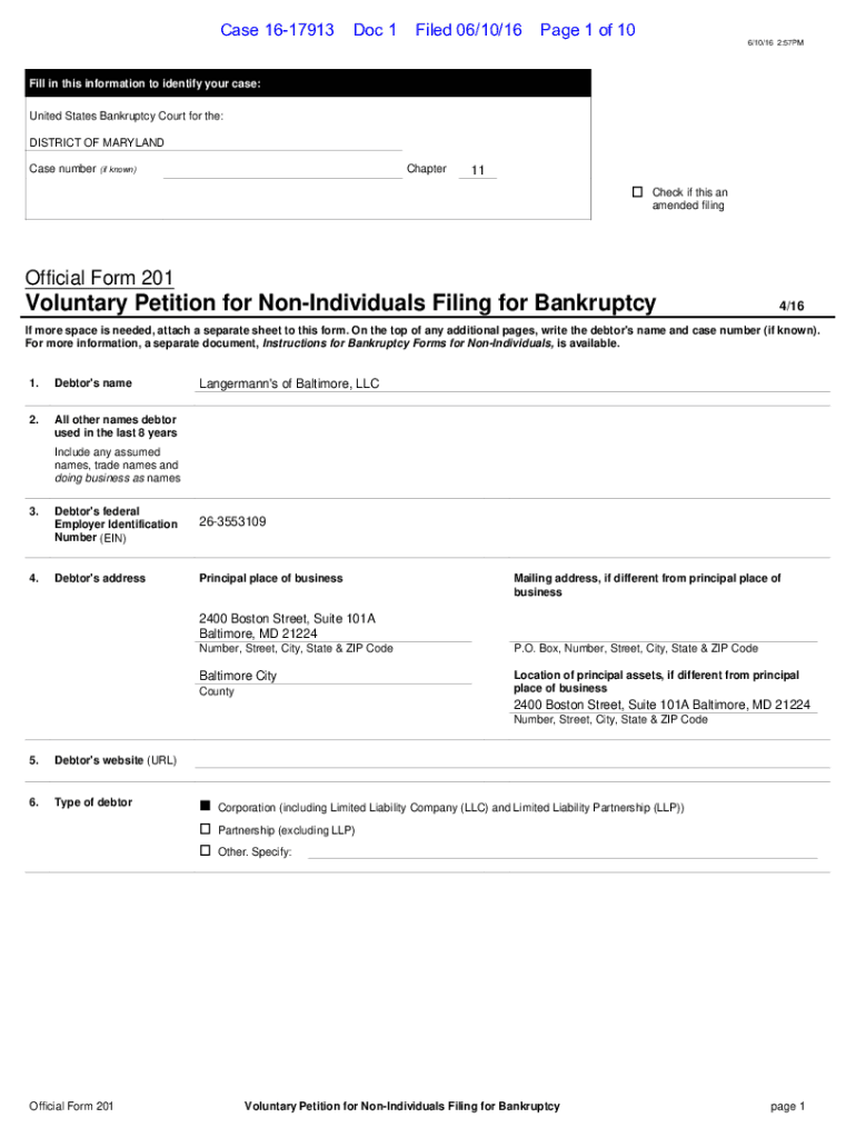 Case 1617913Doc 1Filed 06/10/16Page 1 of 106/10/16 2:57PMFill in this information to identify your case: United States Bankruptcy Court for the: DISTRICT OF MARYLAND Case number (if known)Chapter11