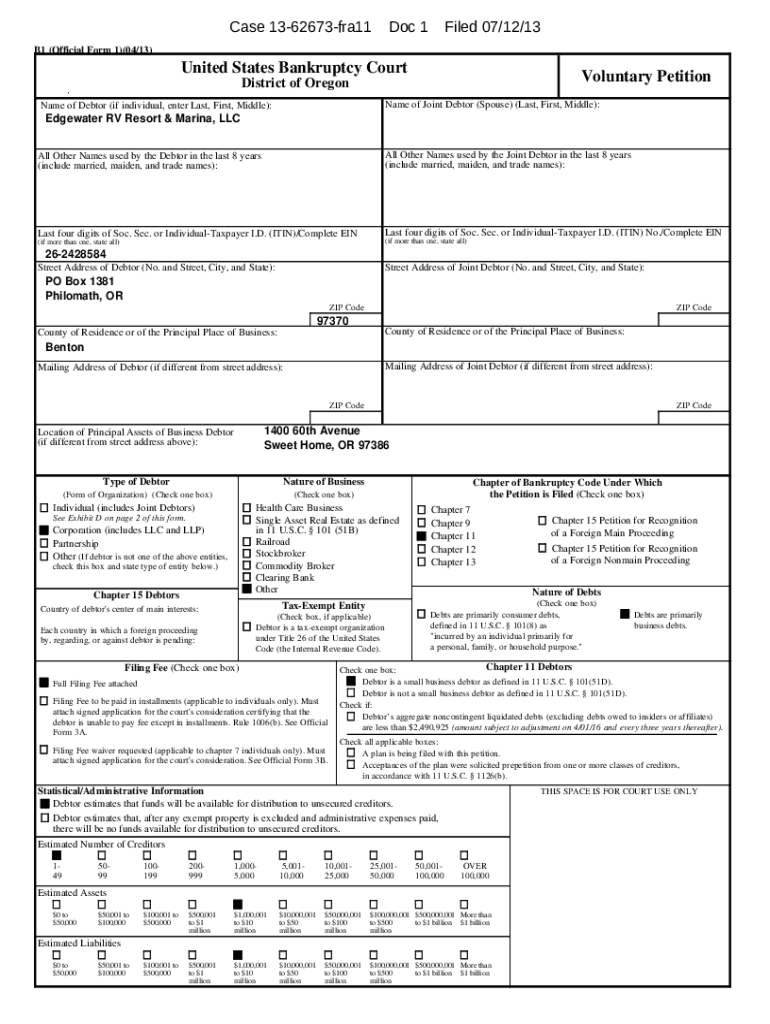 Case 1362673fra11Doc 1Filed 07/12/13B1 (Official Form 1)(04/13)United States Bankruptcy CourtVoluntary PetitionDistrict of Oregon b k 1 F o r m. V l u n t a y P e name of Joint Debtor (Spouse) (Last,