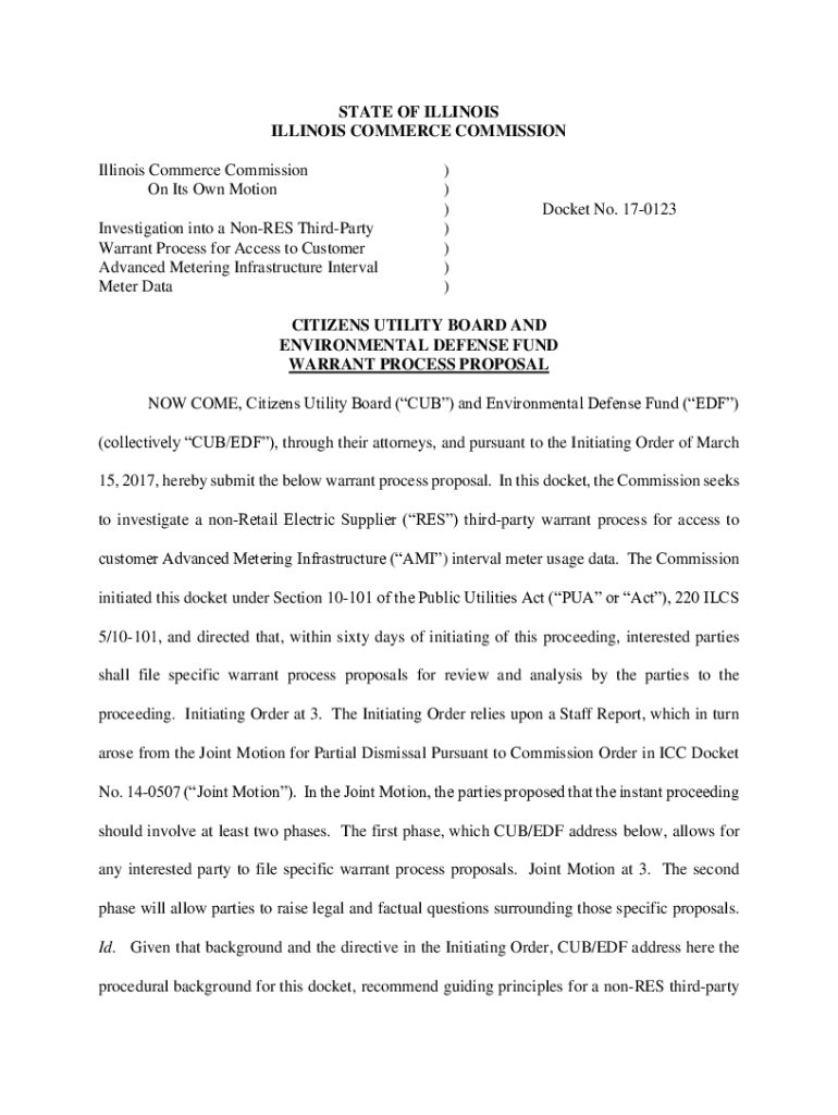 STATE OF ILLINOIS COMMERCE COMMISSION Illinois Commerce Commission On Its Own Motion Investigation into a NonRES ThirdParty Warrant Process for Access to Customer Advanced Metering Infrastructure