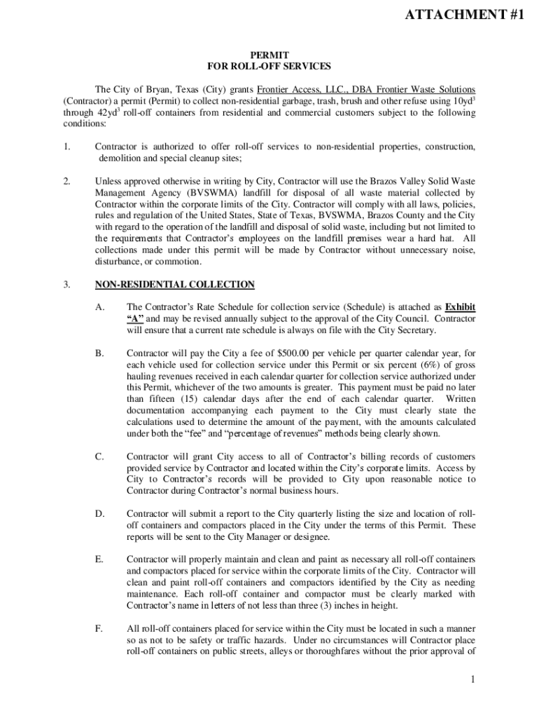 ATTACHMENT #1 PERMIT FOR FALLOFF SERVICES The City of Bryan, Texas (City) grants Frontier Access, LLC., DBA Frontier Waste Solutions (Contractor) a permit (Permit) to collect nonresidential garbage,