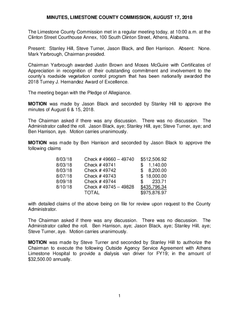 MINUTES, LIMESTONE COUNTY COMMISSION, AUGUST 17, 2018, The Limestone County Commission met in a regular meeting today, at 10:00 a.m. at the Clinton Street Courthouse Annex, 100 South Clinton Street,