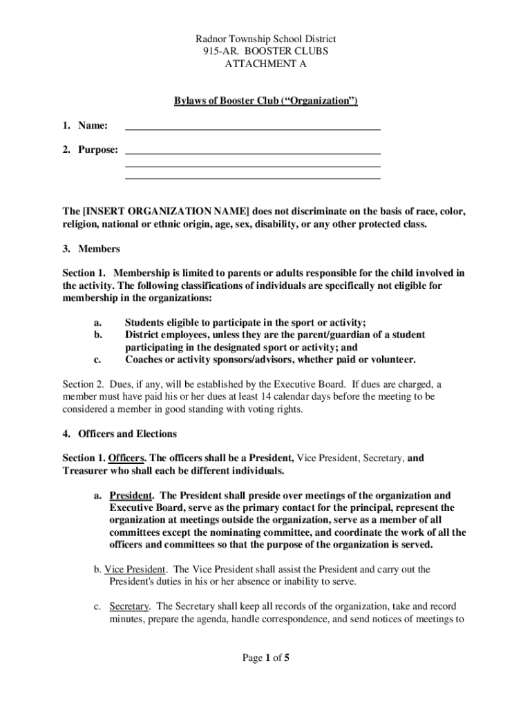 Rad nor Township School District 915AR. BOOSTER CLUBS ATTACHMENT Bylaws of Booster Club (Organization) 1. Name:___2. Purpose: ___ ___ ___The [INSERT ORGANIZATION NAME] does not discriminate on the