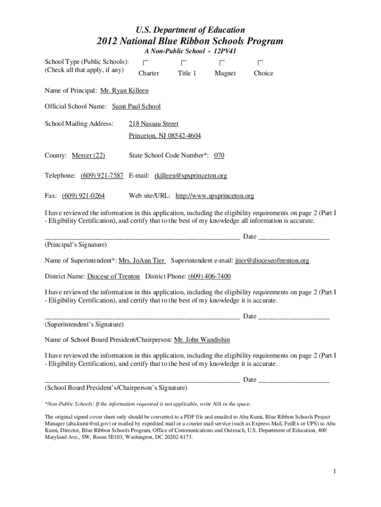U.S. Department of Education2012 National Blue Ribbon Schools Program A Nonpublic School 12PV41 School Type (Public Schools): (Check all that apply, if any)CharterTitle 1MagnetChoiceName of Principal: