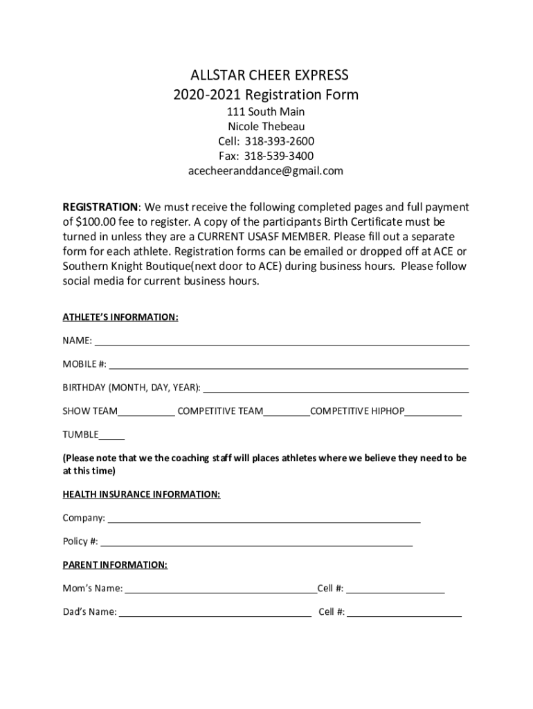 ALL STAR CHEER EXPRESS 20202021 Registration Form 111 South Main Nicole The beau Cell: 3183932600 Fax: 3185393400 acecheeranddance@gmail.com REGISTRATION: We must receive the following completed pages