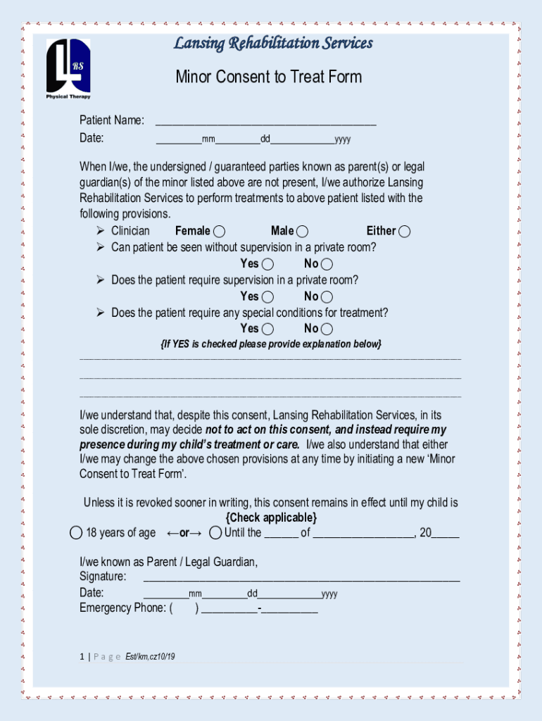 Lansing Rehabilitation Services Minor Consents to Treat Form Patient Name: ___ Date: ___mm___dd___YYY When I/we, the undersigned / guaranteed parties known as parent(s) or legal guardian(s) of the