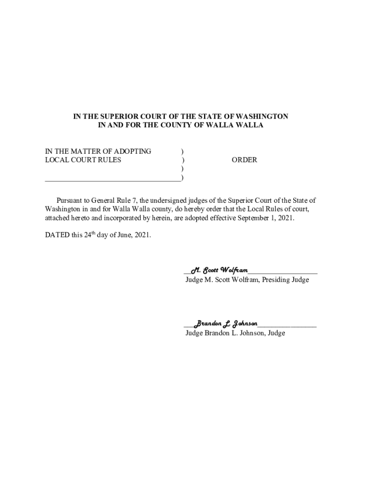 IN THE SUPERIOR COURT OF THE STATE OF WASHINGTON IN AND FOR THE COUNTY OF WALL IN THE MATTER OF ADOPTING LOCAL COURT RULES))) ___)ORDERPursuant to General Rule 7, the undersigned judges of the Superior