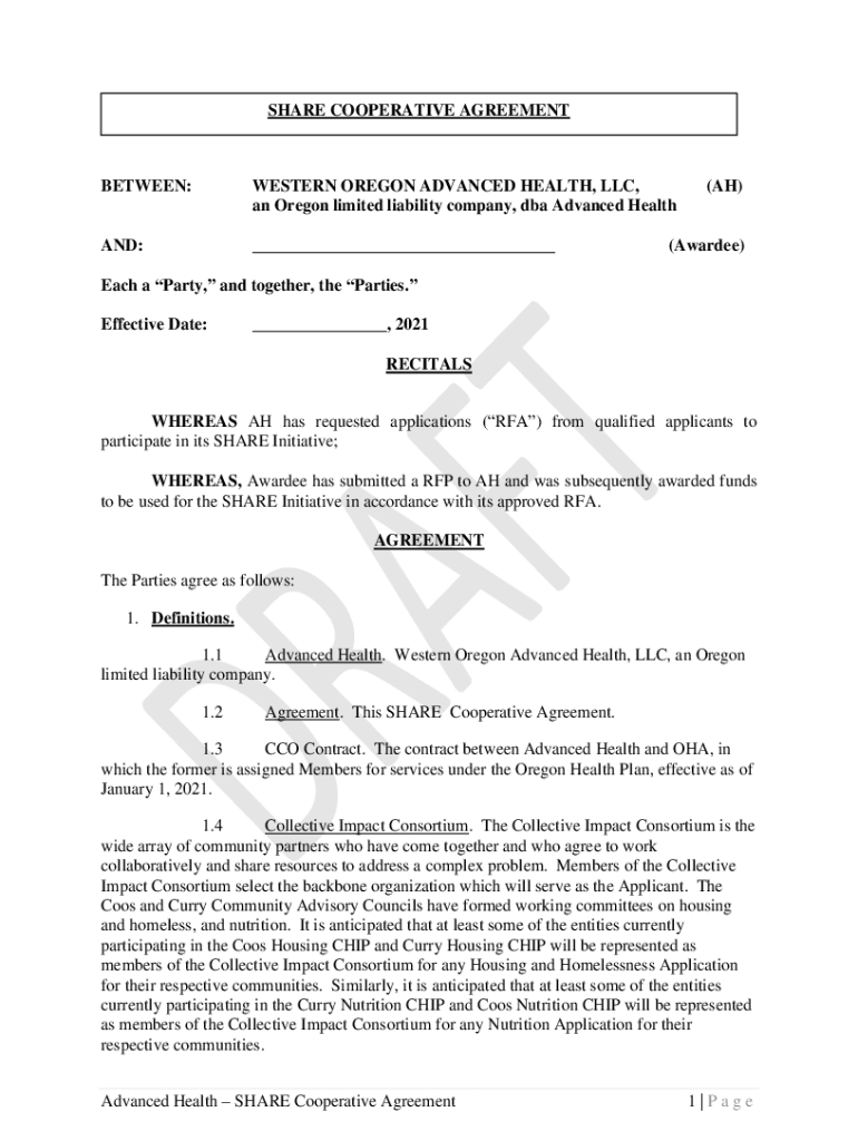 SHARE COOPERATIVE AGREEMENTBETWEEN:WESTERN OREGON ADVANCED HEALTH, LLC, an Oregon limited liability company, DBA Advanced Health AND:___(AH)(Awardee)Each a Party, and together, the Parties. Effective