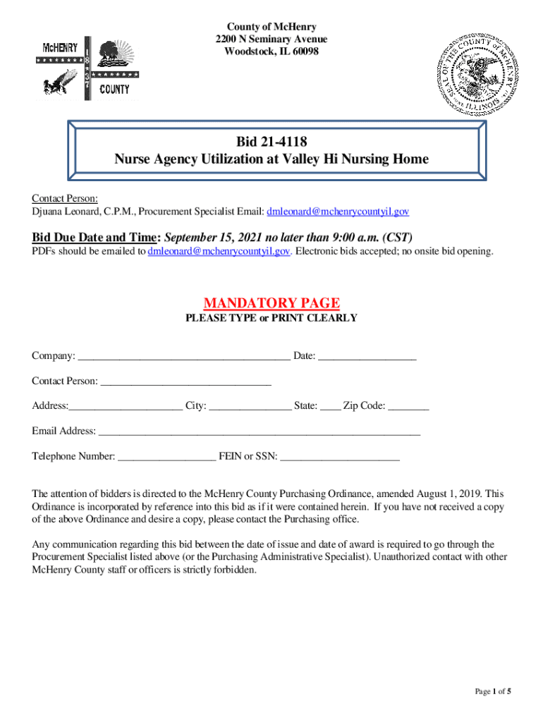 County of McHenry 2200 N Seminary Avenue Woodstock, IL 60098Bid 214118 Nurse Agency Utilization at Valley Hi Nursing Home Contact Person: Juana Leonard, C.P.M., Procurement Specialist Email: dmleonard@mchenrycountyil.govBid