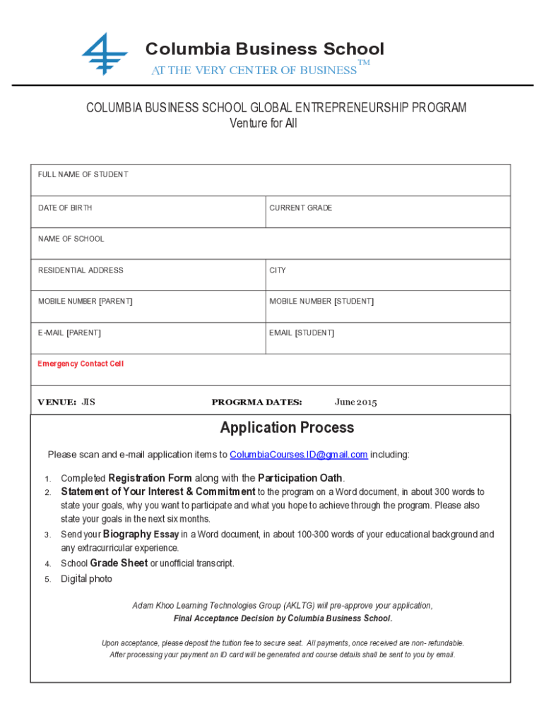 Columbia Business School THAT THE VERY CENTER OF BUSINESSCOLUMBIA BUSINESS SCHOOL GLOBAL ENTREPRENEURSHIP PROGRAM Venture for Full NAME OF STUDENTDATE OF BIRTHCURRENT GRADUATE from OF SCHOOLRESIDENTIAL