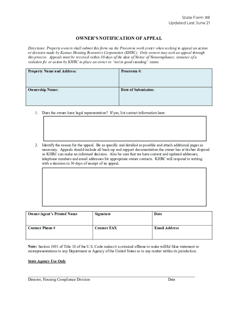 State Form #8 Updated Last June 21OWNERS NOTIFICATION OF APPEAL Directions: Property owners shall submit this form via the Procure work center when seeking to appeal an action or decision made by