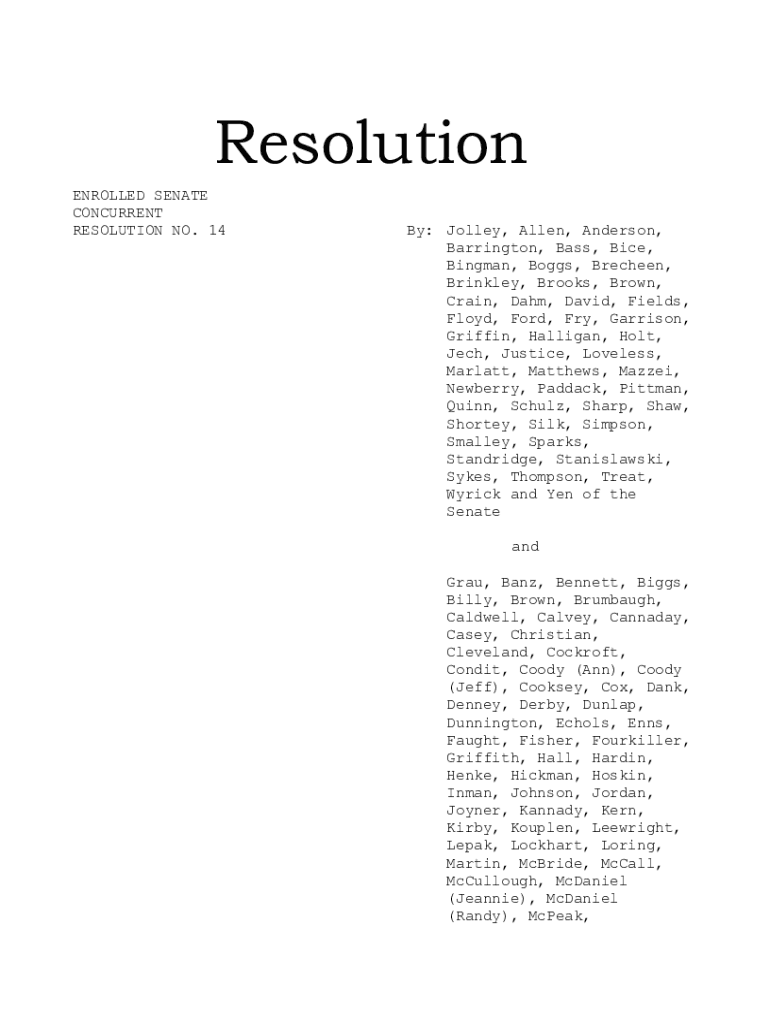Resolution ENROLLED SENATE CONCURRENT RESOLUTION NO. 14By: Volley, Allen, Anderson, Barrington, Bass, Nice, Binman, Boggs, Brethren, Brinkley, Brooks, Brown, Train, Dam, David, Fields, Floyd, Ford,