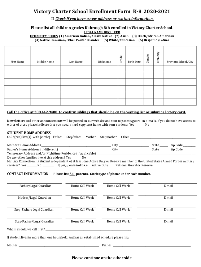 Victory Charter School Enrollment Form K8 20202021 Check if you have a new address or contact information. Please list all children grades K through 8th enrolled in Victory Charter School. Last NameNicknameBirth