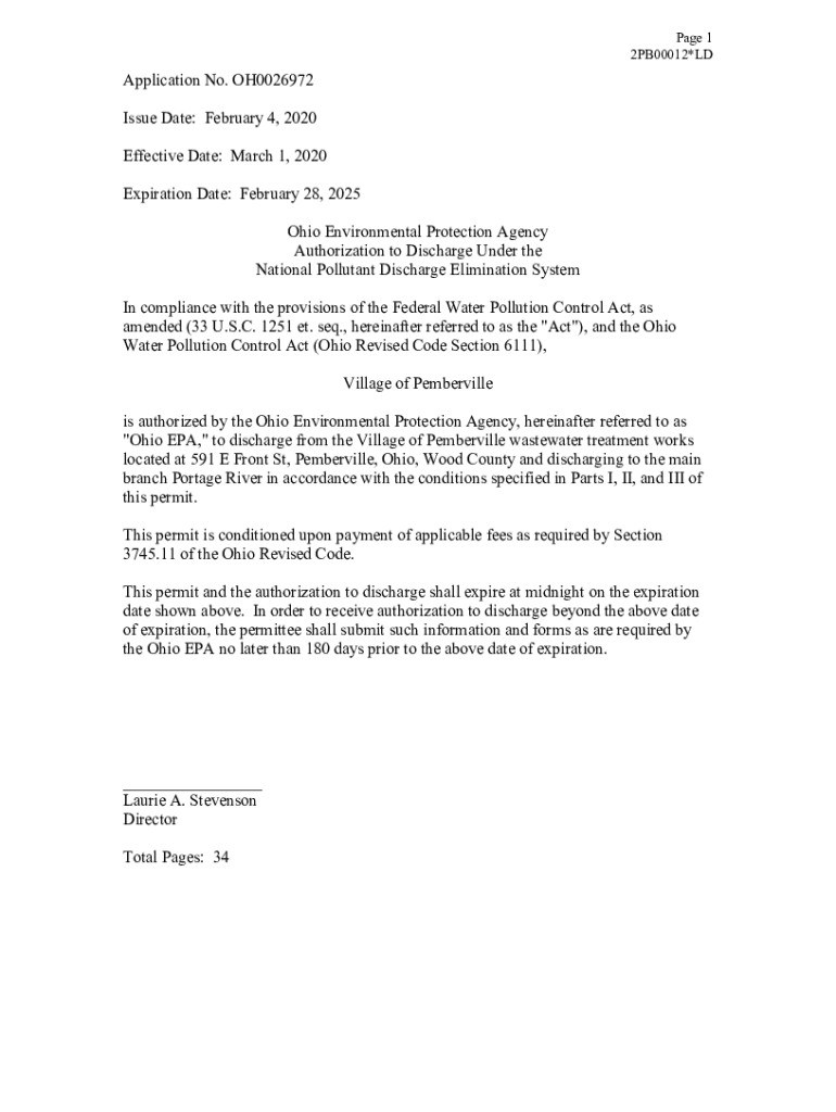 Page 1 2PB00012×Application No. OH0026972 Issue Date: February 4, 2020, Effective Date: March 1, 2020, Expiration Date: February 28, 2025 Ohio Environmental Protection Agency Authorization to Discharge