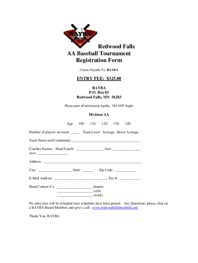 How to fill out MN RAYBA Baseball Tournament Registration Form