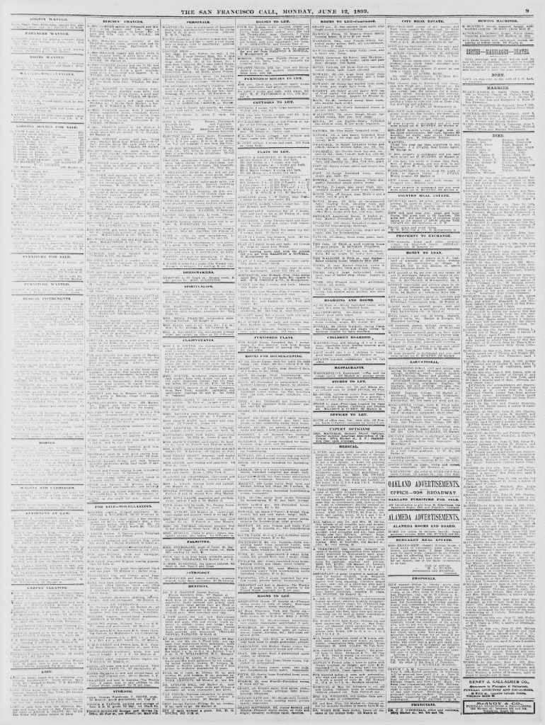 THE SAN FRANCISCO CALL, MONDAY, JUNE 12, 1899. AGENTS WANTED.f BUSINESS\' CHANCES. HOUSES TO LET. PERSONALS. An SSS; CORNER saloon on SixteenttTand MLA WANTED To form acquaintance of honorable FOUR